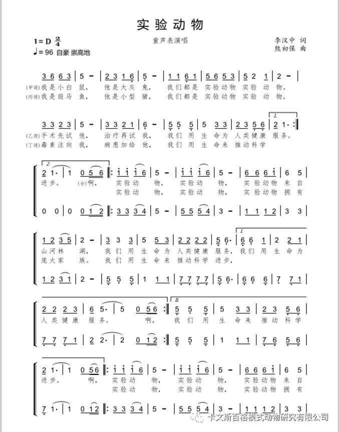 此次新冠肺炎給全球帶來巨大的災(zāi)難,所有人都盼望著疫苗早日研發(fā)成功,用于臨床并投入市場。而在此之前,疫苗都會進入動物試驗階段,可以說動物是在用它們的生命守護人類的生命。在疫情期間,常州卡文斯實驗動物有限公司邀請中國音樂家協(xié)會會員、南京市音樂家協(xié)會理事熊初保和江蘇實驗動物工作者李漢中共同創(chuàng)作了這首《實驗動物》,音樂創(chuàng)作人周童編曲并錄制,由新北區(qū)三井實驗小學(xué)的同學(xué)們演唱而共同完成這首公益作品。